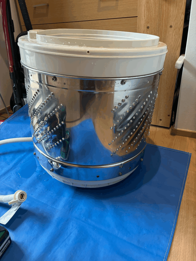 来てもらって現物確認が済めば、さっそく洗濯槽の分解が始まりました。